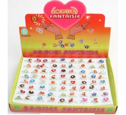 Vendu uniquement par lot de 72. 12 modèles assortis dans un même lot. Dimensions de l'emballage : 16 x 22 x 2 cm.Le prix indiqué = prix du lot de 72 bagues.